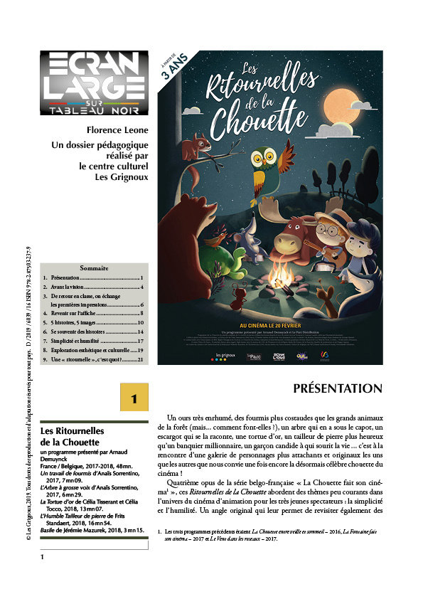 Quatrième opus de la série belgo-française « La Chouette fait son cinéma », ces Ritournelles de la Chouette abordent des thèmes peu courants dans l’univers du cinéma d’animation pour les très jeunes spectateurs : la simplicité, la modestie, l’humilité. Un angle original qui leur permet de revisiter également des thèmes et valeurs auxquels le spectateur est déjà plus habitué tels que la solidarité, l’amitié ou encore l’estime de soi. Les cinq histoires, adaptées pour la plupart de contes traditionnels, offrent ainsi une belle réflexion philosophique abordable avec des tout petits ainsi qu’une variété d’univers graphiques mettant la nature en valeur.