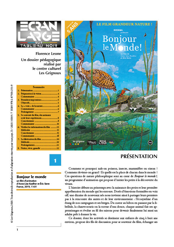 Comment et pourquoi naît-on poisson, insecte, mammifère ou oiseau ? Comment devient-on grand ? Et quelle est la place de chacun dans le monde ? Ces questions de nature philosophique sont au cœur de Bonjour le monde !, un programme d’animation qui propose d’initier les petits à la découverte du vivant. L’histoire débute au printemps avec la naissance des petits et leur première appréhension du monde qui les entoure. Dotés d’émotions formulées en voix off, une dizaine de nouveaux-nés nous invitent ainsi à partager leurs premiers pas à la rencontre des autres et de leur environnement : l’écosystème d’un étang de nos campagnes et ses berges. Du castor au hibou en passant par la libellule, la chauve-souris ou la tortue d’eau douce, chaque animal fait ses apprentissages et évolue au fil des saisons pour devenir finalement lui aussi un adulte prêt à donner la vie.
